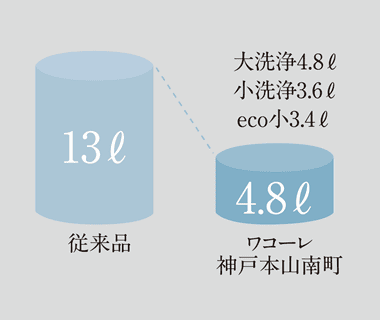 環境にやさしく、しかも経済的。洗浄使用量は大4.8ℓ/小3.6ℓ/eco小3.4ℓと従来品に比べ約71%の節水が可能※。水道料金を大幅に節約できます。※4人家族(男性:2人、女性:2人)を想定。諸条件により多少異なります。※メーカー調べ。