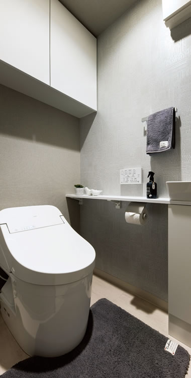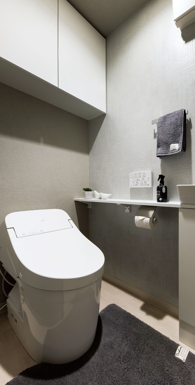 トイレ内を有効に使える吊戸棚を設置。トイレットペーパーなどをすっきりと収納できます。
