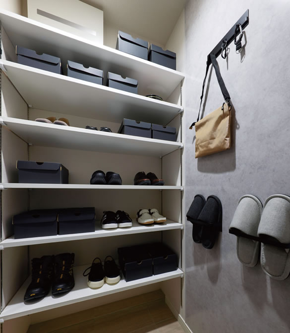 大容量のシューズインクローク。ゴルフバックやキャリーケースなども入る大きな収納スペースです。※F・Jタイプに採用。タイプにより仕様が異なります。※壁はオプション仕様となります。