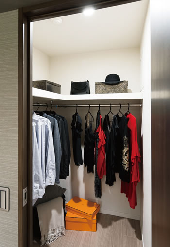 季節用品やワードローブなど多彩な生活アイテムを整理、収納できるゆとりのウォークインクロゼットを設けています。※E・Eg・Fタイプに採用。 タイプにより仕様が異なります。