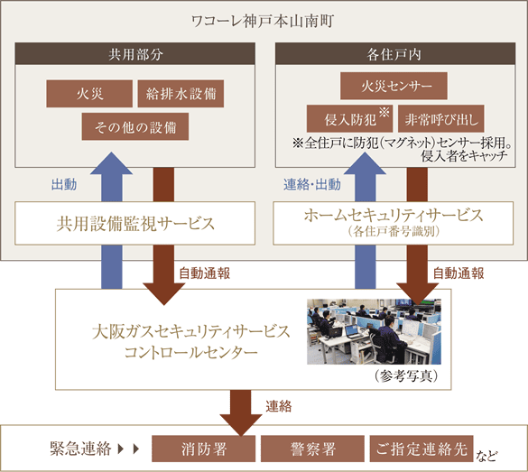大阪ガスセキュリティサービスのコントロールセンターに自動通報。