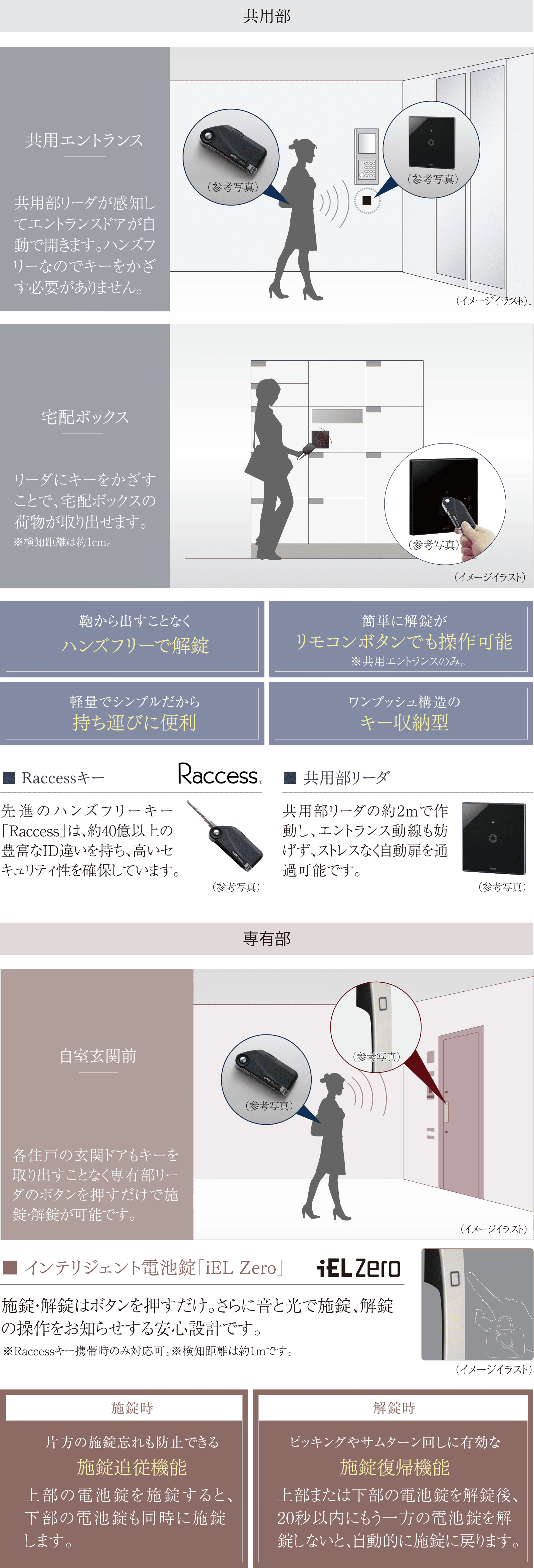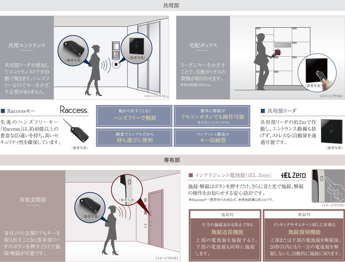 各邸の玄関ドアもキーを携帯したままリーダのボタンを押すだけで施錠・解錠。高いセキュリティ性と快適性を両立した先進システムです。