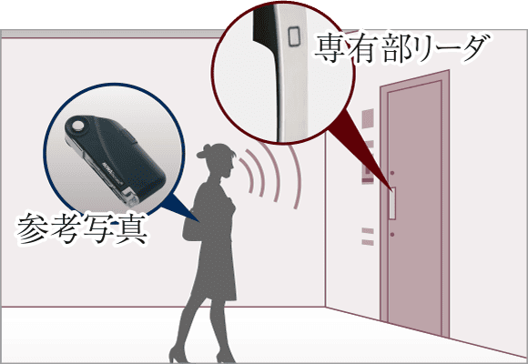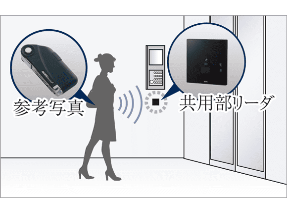 共用部リーダが感知してエントランスドアが自動で開きます。ハンズフリーなのでキーをかざす必要がありません。※認証範囲:約2m。