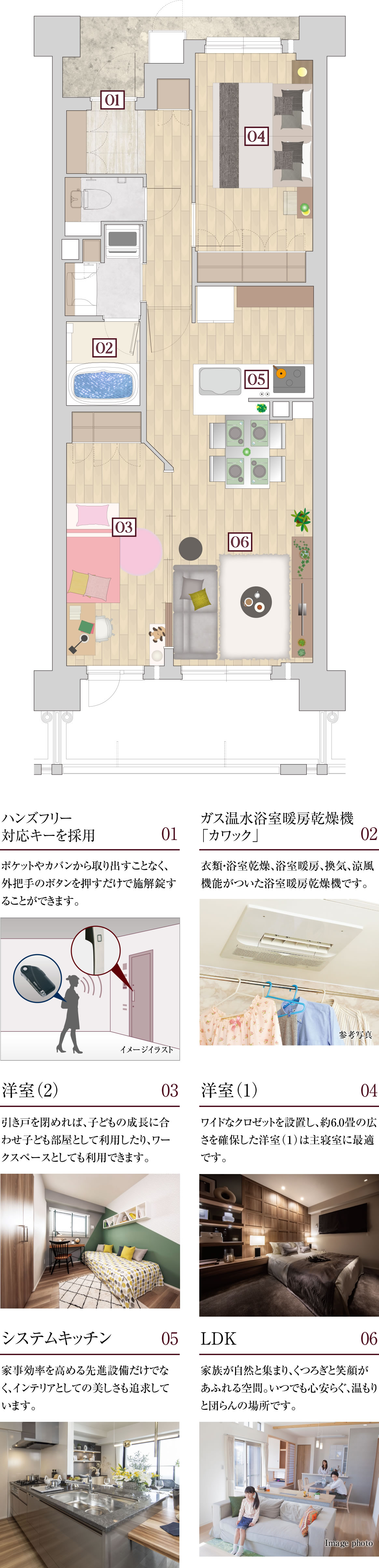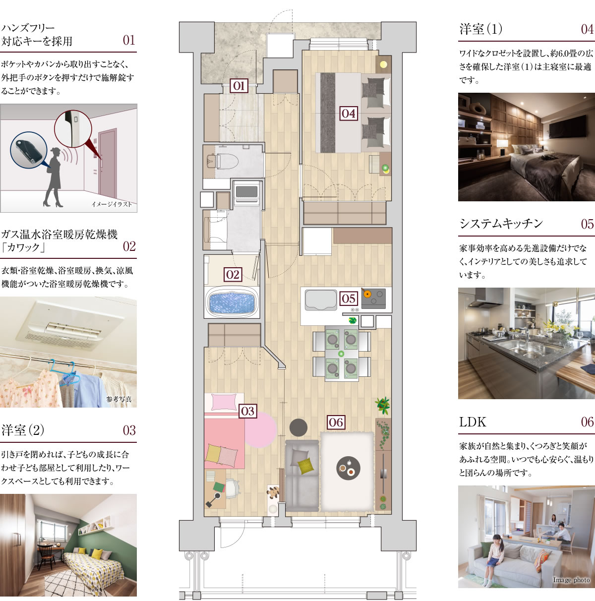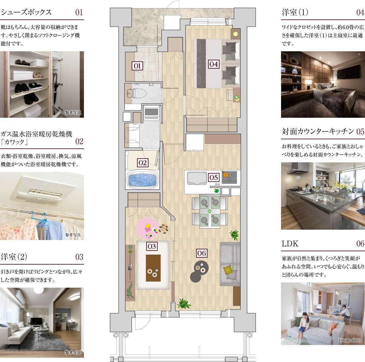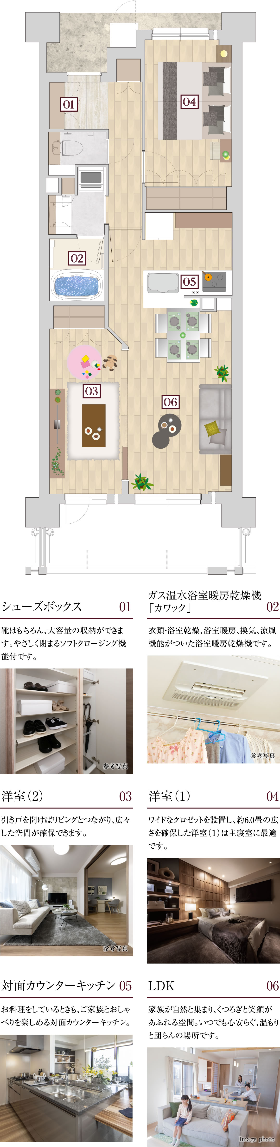※掲載の室内写真は2021年5月に「ワコーレ武庫之荘マンションギャラリー」コンセプトルームにて撮影したもので、実際の住戸とは異なります。また、一部オプション仕様が含まれている他、家具・備品等は販売価格に含まれておりません。あらかじめご了承ください。