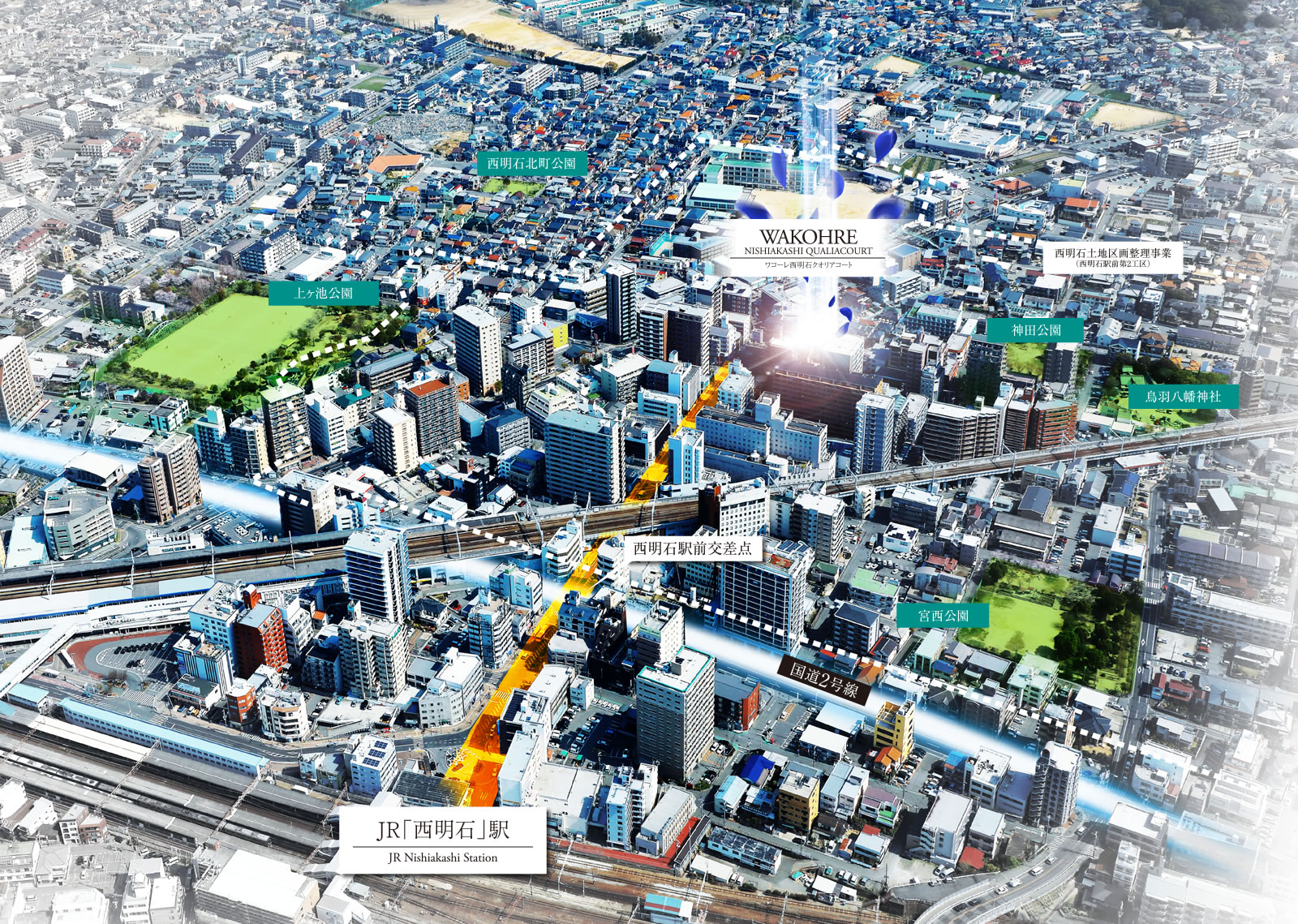 ※掲載の航空写真は2025年4月に撮影のものに、一部CG加工を施しており、実際とは多少異なります。なお、現地の光柱は本物件の位置を示すものであり、建物の高さや規模を示すものではありません。※掲載の外観完成予想図は、設計図を基に描き起こしたもので、官公庁の指導、施工上の都合等により建物の形状・色調・植栽等に変更が生じる場合があります。また、周辺の建物・電柱等は省略しており、実際とは異なります。※掲載の間取りは設計図を基に描き起こしたもので、官公庁の指導、施工上の都合等により、多少変更が生じる場合があります。あらかじめご了承ください。