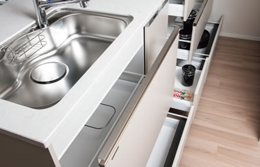 収納物が出し入れしやすいオールスライドキャビネット。やさしく閉まるソフトクロージング※1機能付です。※1:ガス横小引出しは除く。