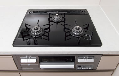 温度調整機能とダブル高火力&ダブルトロ火機能を搭載した3口ガスコンロを採用。3口なので効率的な調理が可能です。