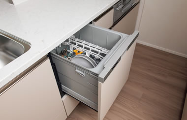 後片付けの手間を減らせ、食器の出し入れも楽な姿勢で行えるスライドオープンタイプの食器洗い乾燥機を採用しています。