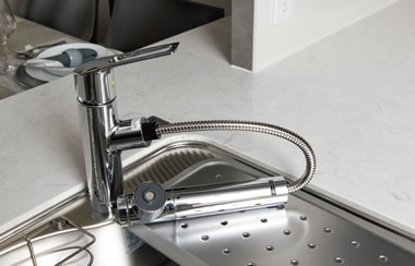 レバーひとつで浄水と水道水の切り替えが可能。シャワーヘッドを引き出して、シンクのすみずみまで洗えます。