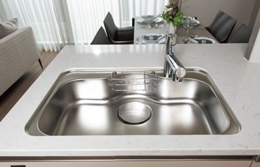 大きな鍋もゆったり洗えるシンクは、シンク制振材の効果によりシンクの水ハネの音を軽減します。