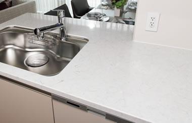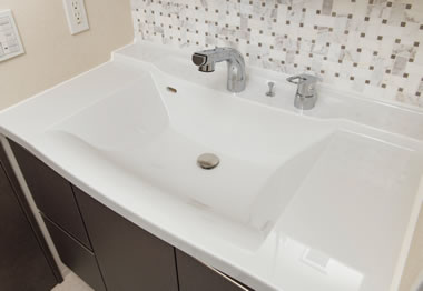 汚れにくくキズつきにくい人造大理石一体型カウンターを採用しました。上質な素材感で、お手入れも簡単です。