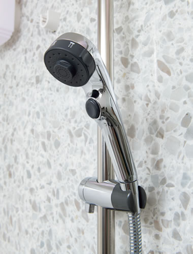 簡単に操作できる止水スイッチを備えたシャワー。節水効果が高く、省エネにも有効です。