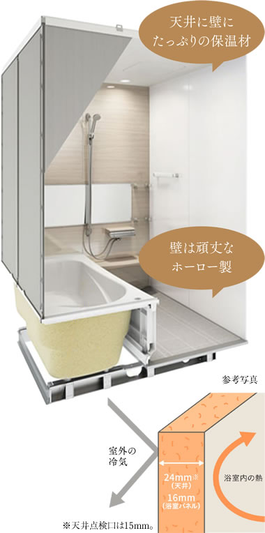 極厚の保温材で浴室周囲をぐるりと囲んでぬくもりをキープ。