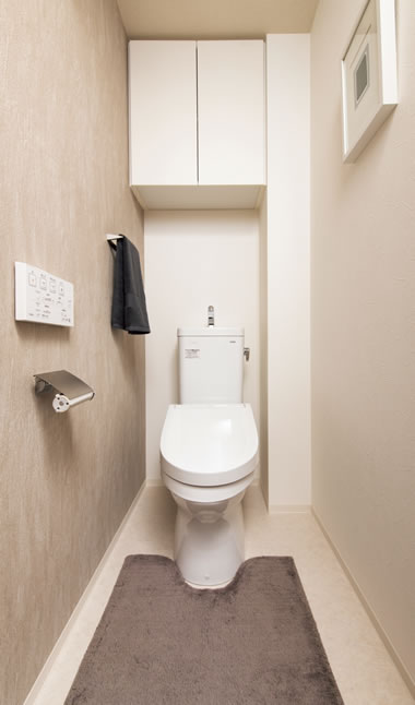 トイレ内を有効に使える吊戸棚タイプの収納スペース。トイレットペーパーなどをすっきりと収納できます。