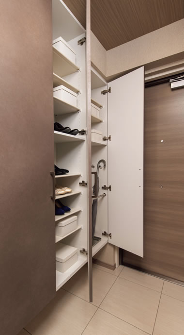 可動棚によりブーツなどもすっきり収納できる機能的なトールタイプのシューズボックスを採用しています。※一部タイプ除く。