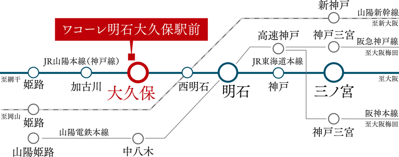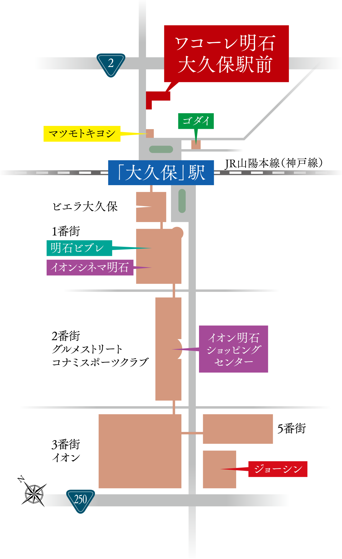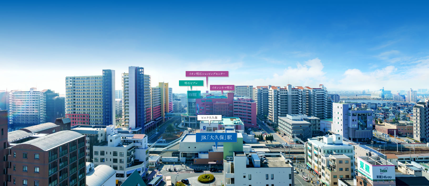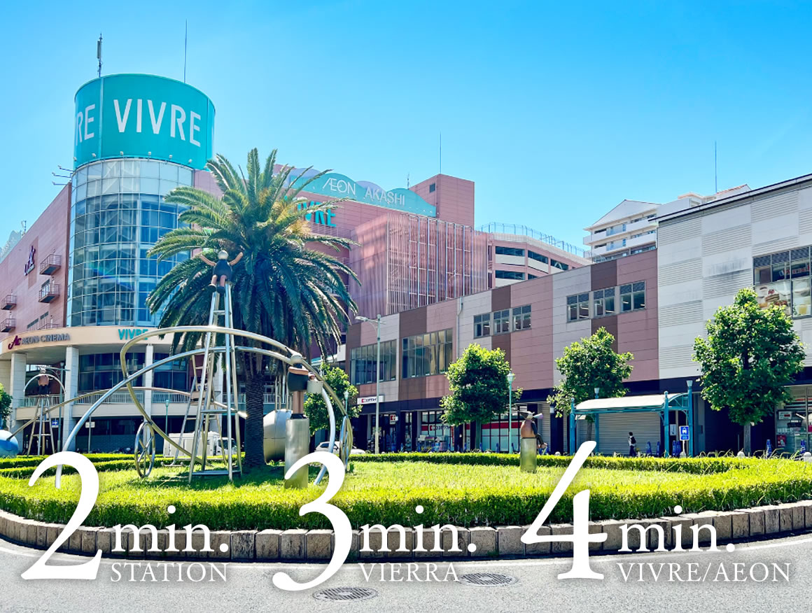 JR「大久保」駅の南側には、駅からペデストリアンデッキで「ビエラ大久保」や「明石ビブレ」、「イオンシネマ明石」などの「イオン明石ショッピングセンター」がつながっており、一大ショッピングモールを形成。ほかにも、多彩なライフシーンに応えてくれるお店や施設が近接して充実しています。
