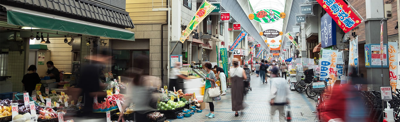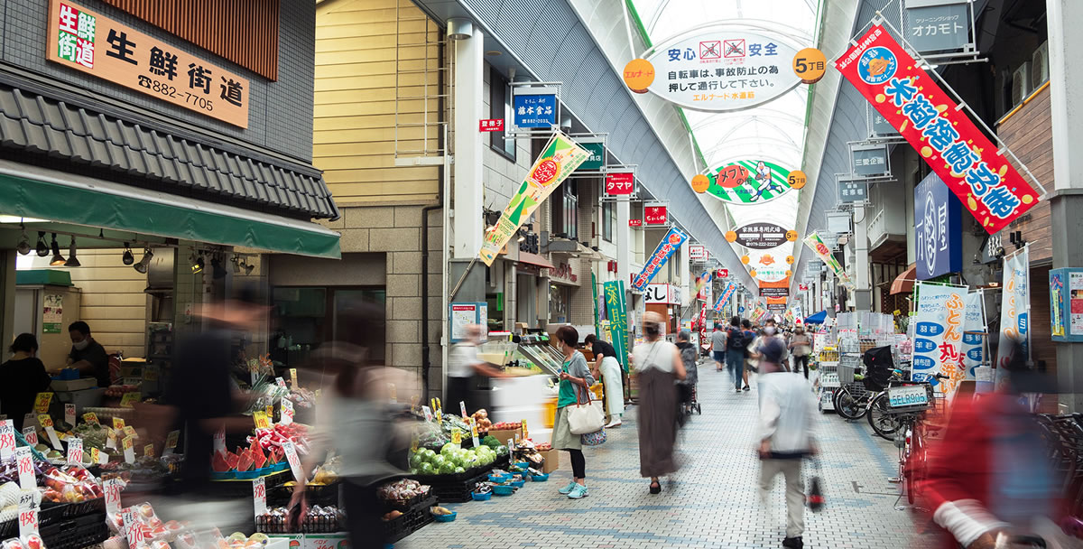 水道筋商店街を通り、行きも帰りも楽しく。