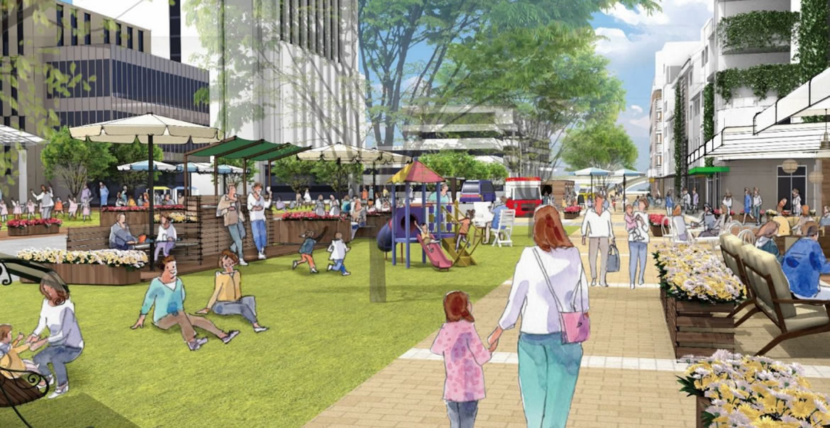 道路空間の賑わい利用や既存ストックの改修・改変で歩きたくなるウォーカブルな空間へ。