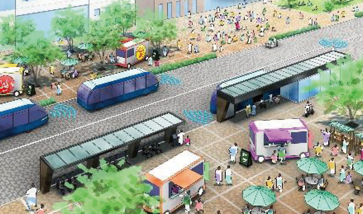 - ●自動運転技術と車道・歩道・Minaさかいで憩い、交流する空間を形成