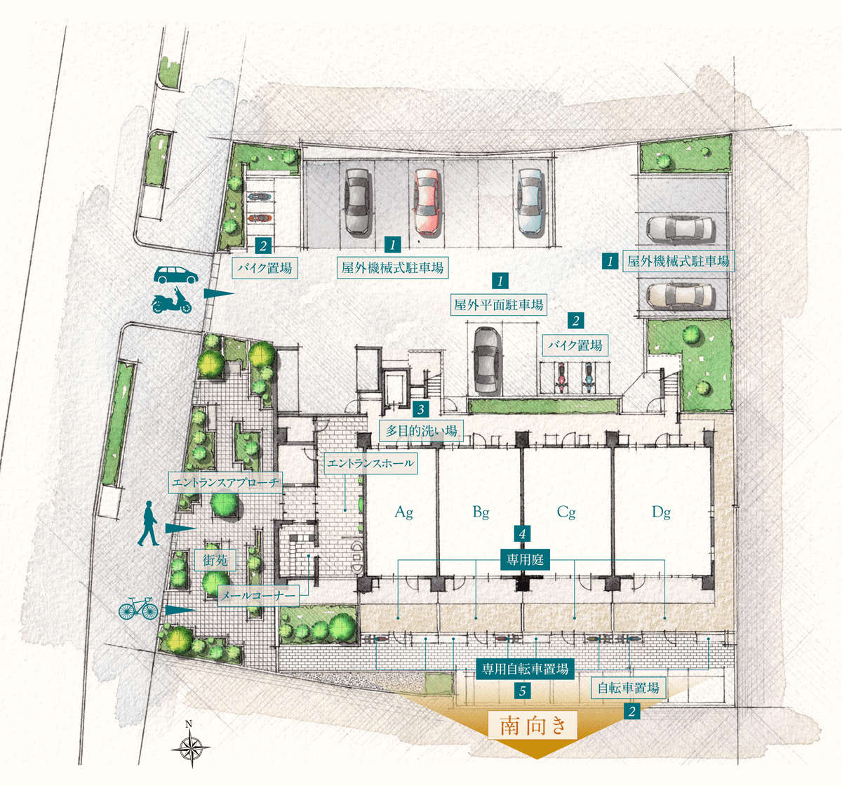1階住戸の4邸には、アウトドアリビングとして南向きの陽光と土の感触が楽しめる専用庭を確保。