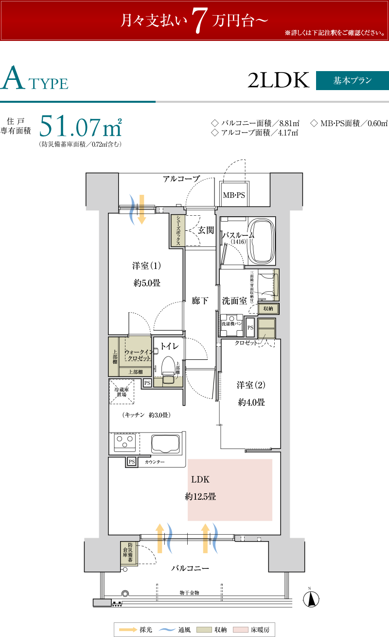 頭金0円、月々返済79,665円、ボーナス払い50,431円■提携住宅ローンのご案内◎取扱金融機関/都市銀行◎借入申込資格/1.購入物件に自ら居住できる方。2.借入時の年齢満18歳以上39歳11ヶ月までの方で、完済時満80歳のお誕生日までの方。3.団体信用生命保険に加入できる方。◎銀行手数料/ご融資金額に対して2.2%(税込)※諸条件により融資条件は異なる場合がございます。◎金利/変動金利◎適用金利/0.975%(優遇金利2.05%)・元利均等返済利用(自己資金20%未満)◎借入期間/39年11ヶ月※返済例はお客様の年齢・収入等諸条件により若干異なる場合があります。あらかじめご了承ください。※金利は2025年8月1日現在のものです。※別途火災保険加入料が必要となります。※詳しくは係員にお尋ねください。