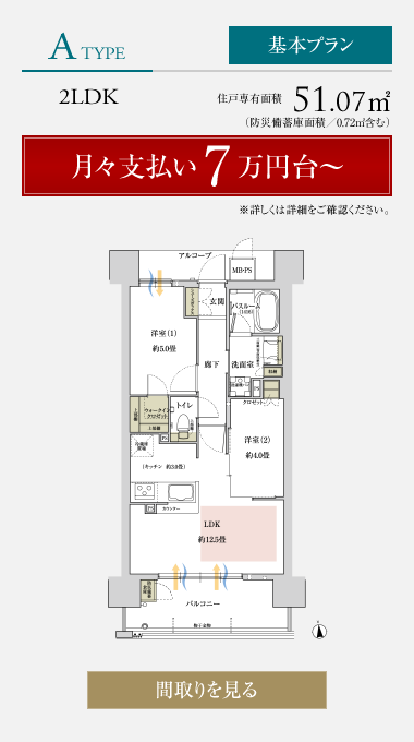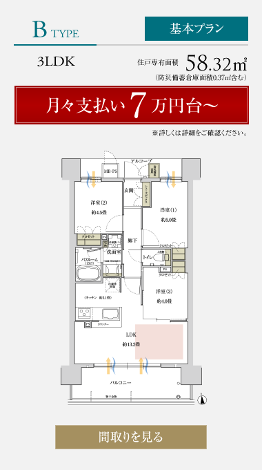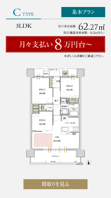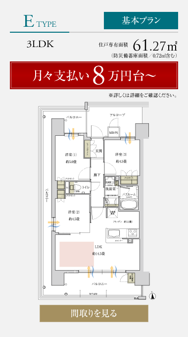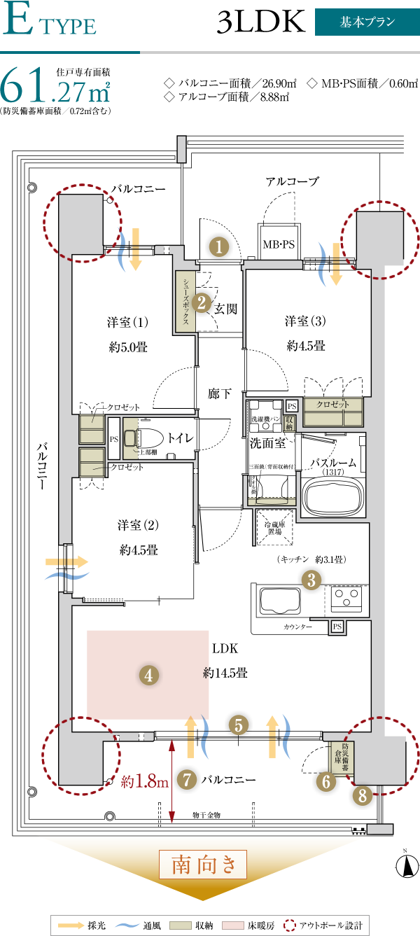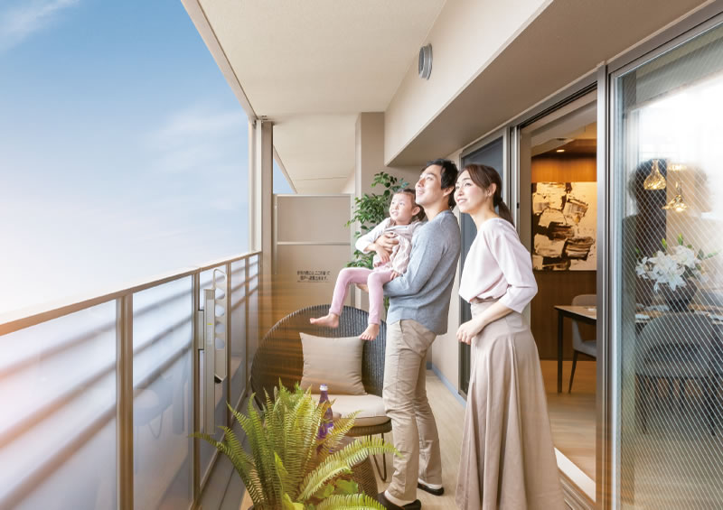 バルコニー幅が1.8mで広々バルコニー。全邸南向きの住戸レイアウトで開放的な暮らしを満喫できます。