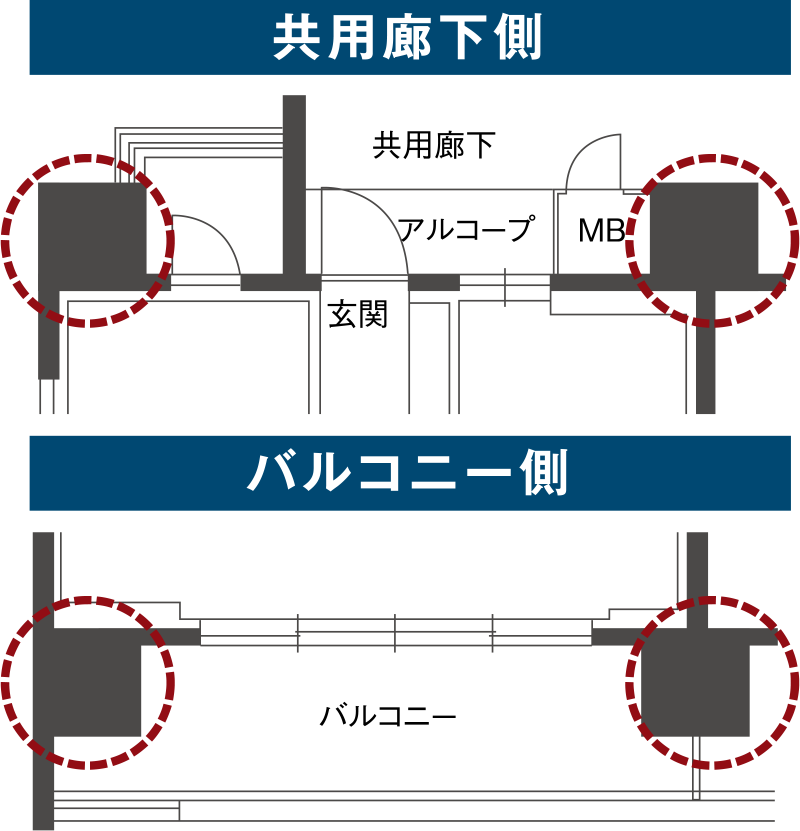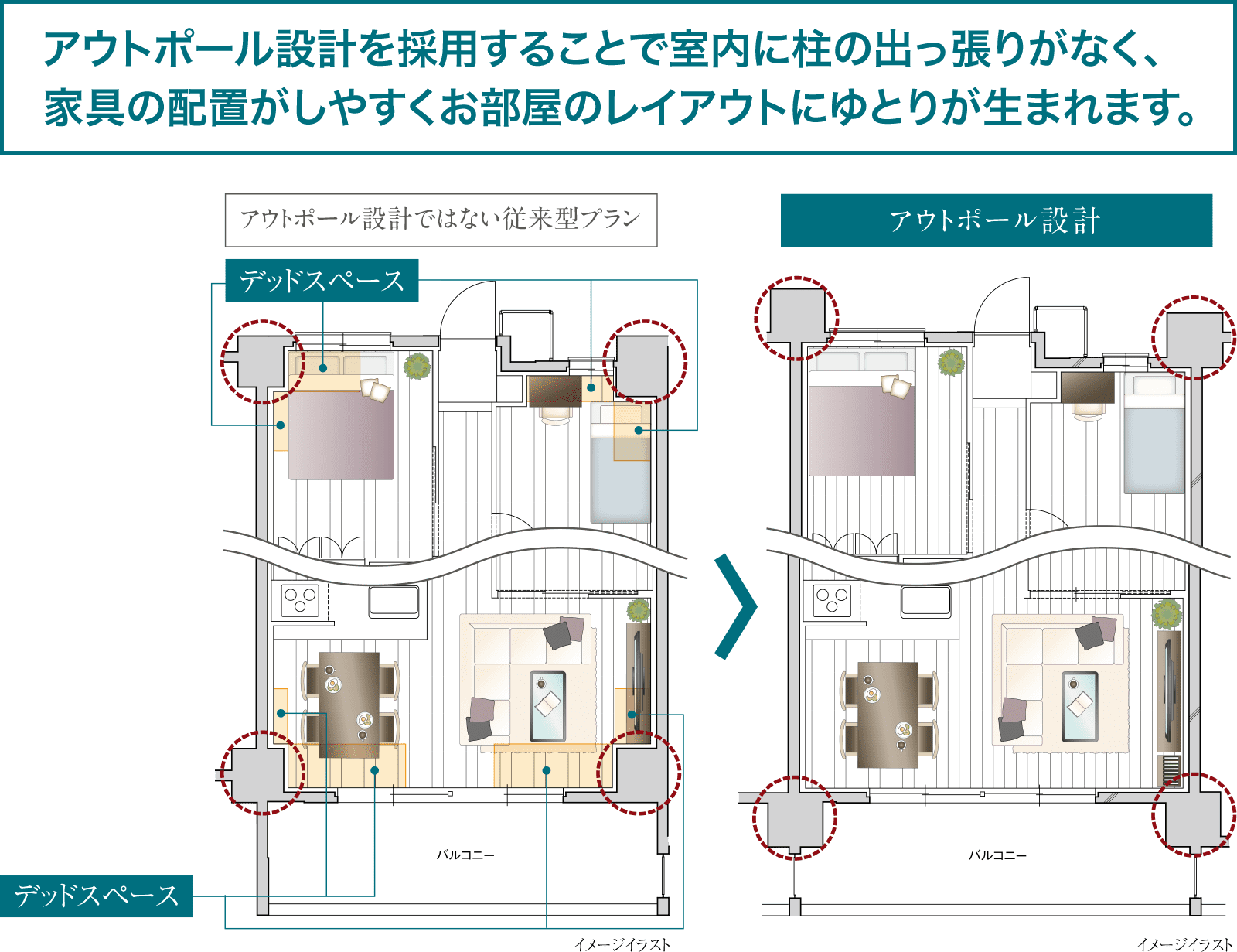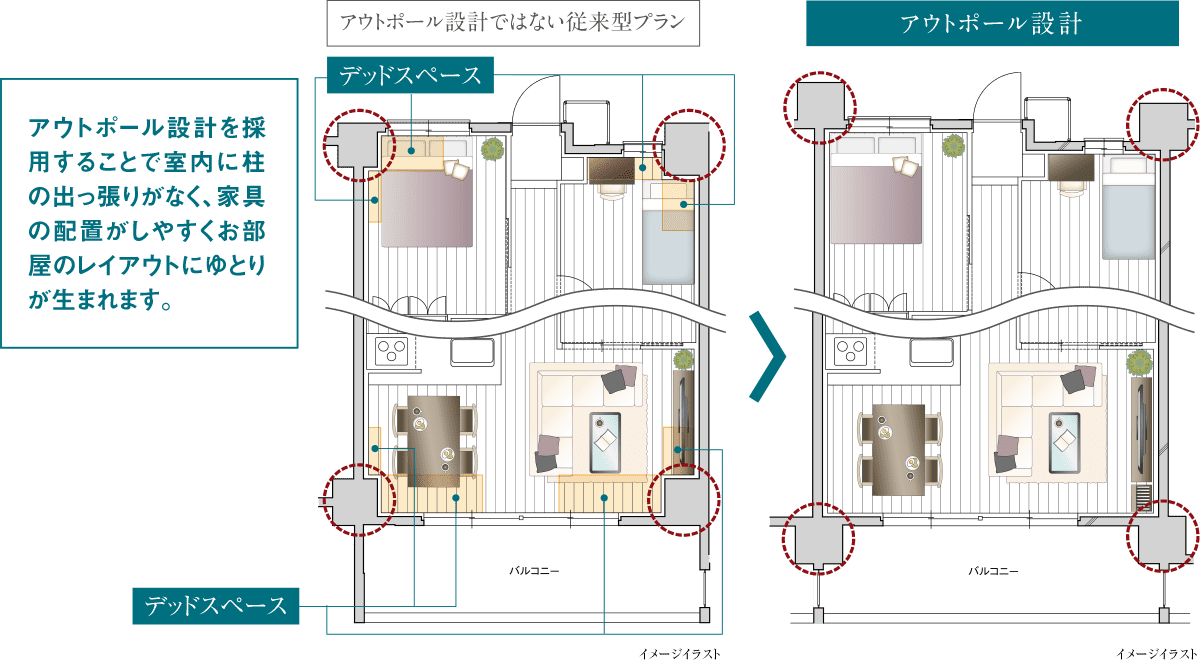 室内に柱の出っ張りがなく、家具の配置がしやすく、お部屋のレイアウトにゆとりが生まれます。
