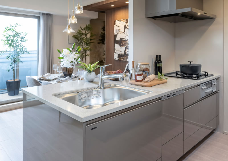 リビングが見渡せる、開放感のあるキッチン。機能性と使い勝手の良い3口ガスコンロやスライド収納を採用。