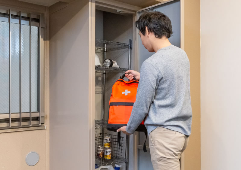 全邸に防災関連の備品を入れることのできる防災備蓄倉庫を設置。
