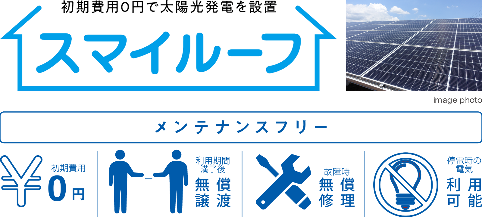 「スマイルーフ」は大阪ガスが無償で屋根に太陽光パネルを設置し、お客様は15年間、日中の電気料金を低額で利用できるサービスです。サービス期間中は大阪ガスが無料で保守・点検してくれます。お客様は電気代も節約でき、停電時にも電気が使えて安心。さらに15年後には太陽光発電設備を無償でもらえるのもうれしいシステムです。