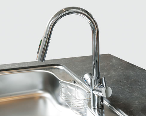 ハンスグローエ社の洗練されたデザイン。内蔵の浄水器は高性能ろ過法式で不純物から雑菌まで除去します。