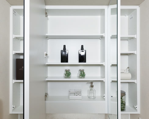 ワイドで使いやすい3面鏡。鏡裏は全面が収納スペースになっており、ヘアケア用品や歯ブラシなど小物を整頓しながら保管できます。※Fタイプは6面鏡。