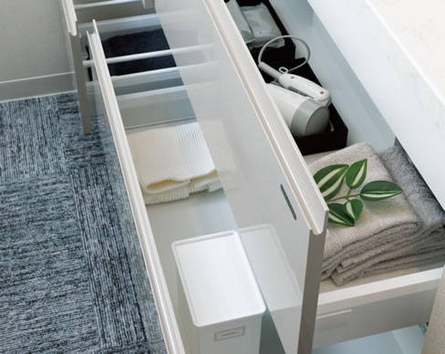 引き出し中箱の形状を凹型にすることで排水管等の干渉をさけて有効に収納できるキャビネット。ソフトクローズ機能付のスライドタイプです。※床の仕上げは実際とは異なります。