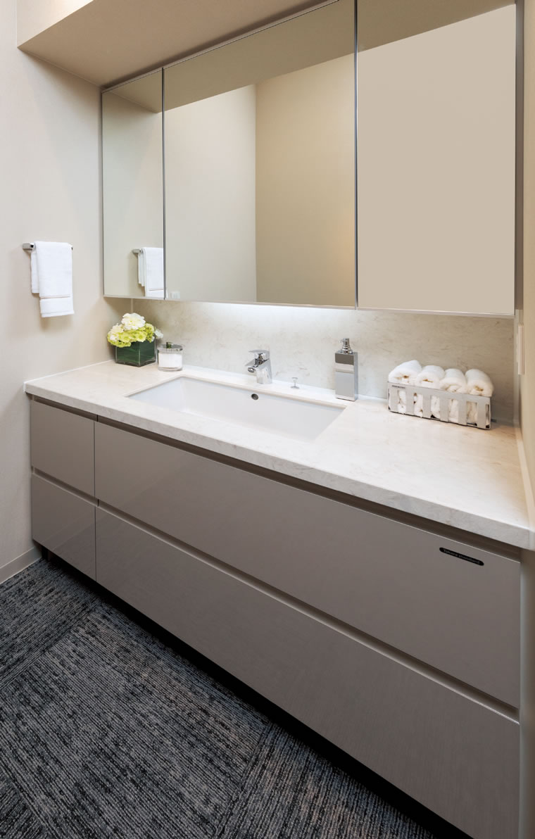 タオル類の整理や水廻り用品のストックなどに便利な収納を設置しました。※タイプにより仕様が異なります。