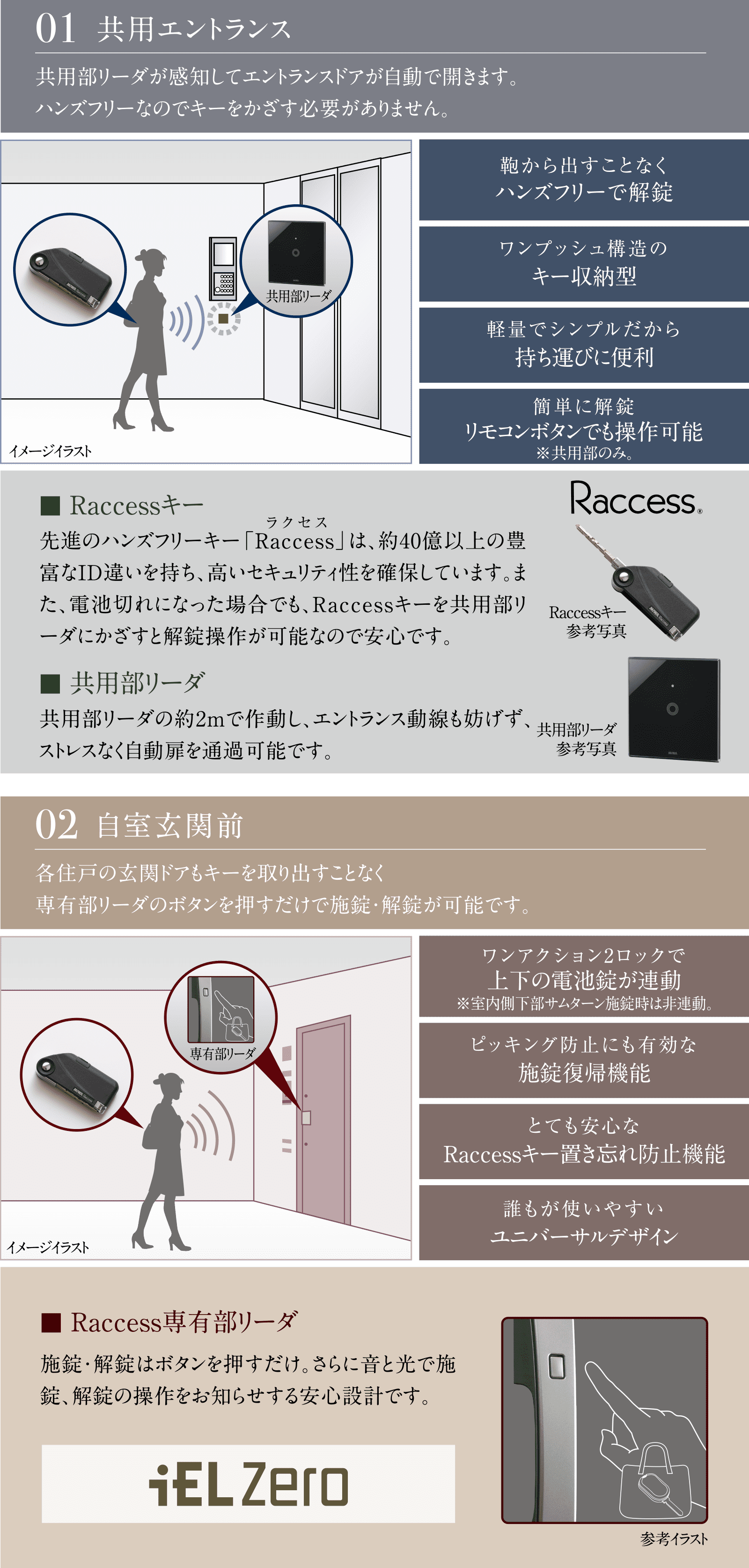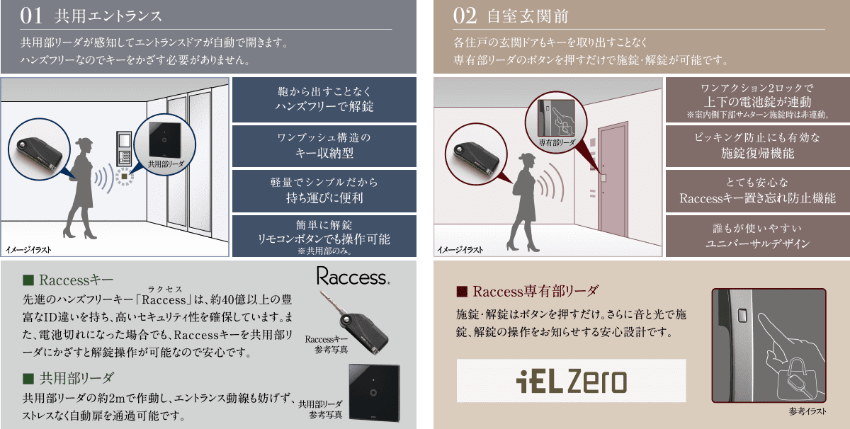 各邸の玄関ドアもキーを携帯したままリーダの解錠ボタンを押すだけ。高いセキュリティ性と快適性を両立した先進システムです。