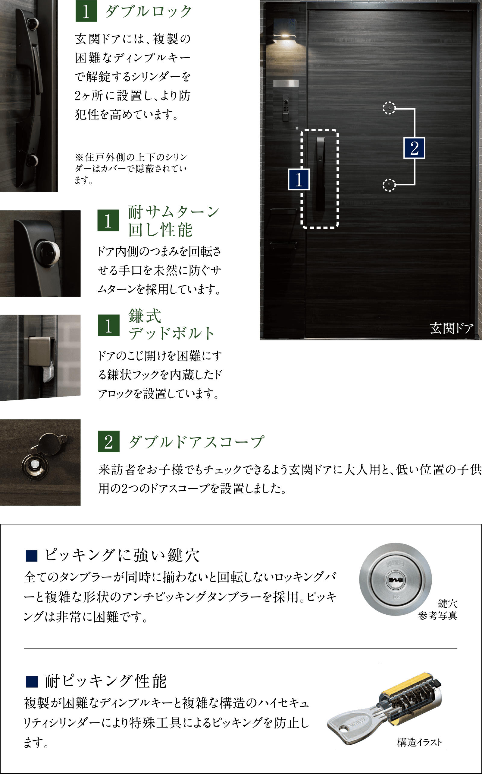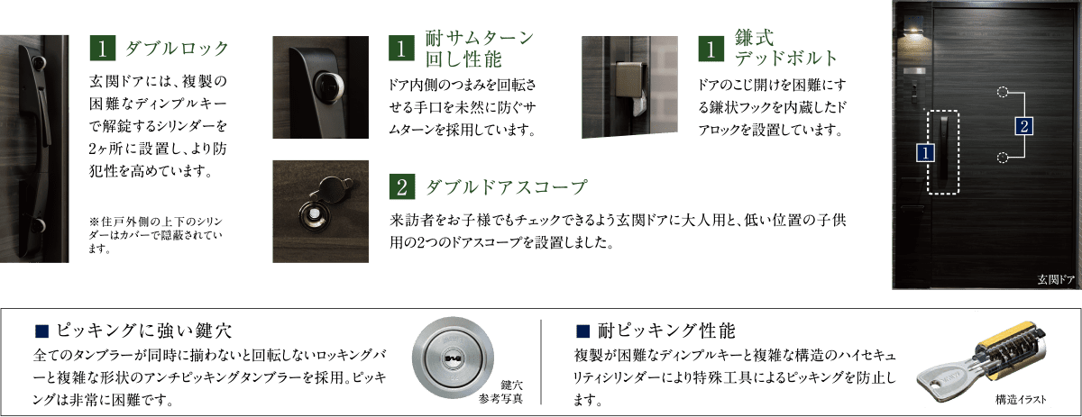 ピッキングやサムターン回しなど、さまざまな不正解錠を防ぐセキュリティ機能を玄関ドアに設けました。