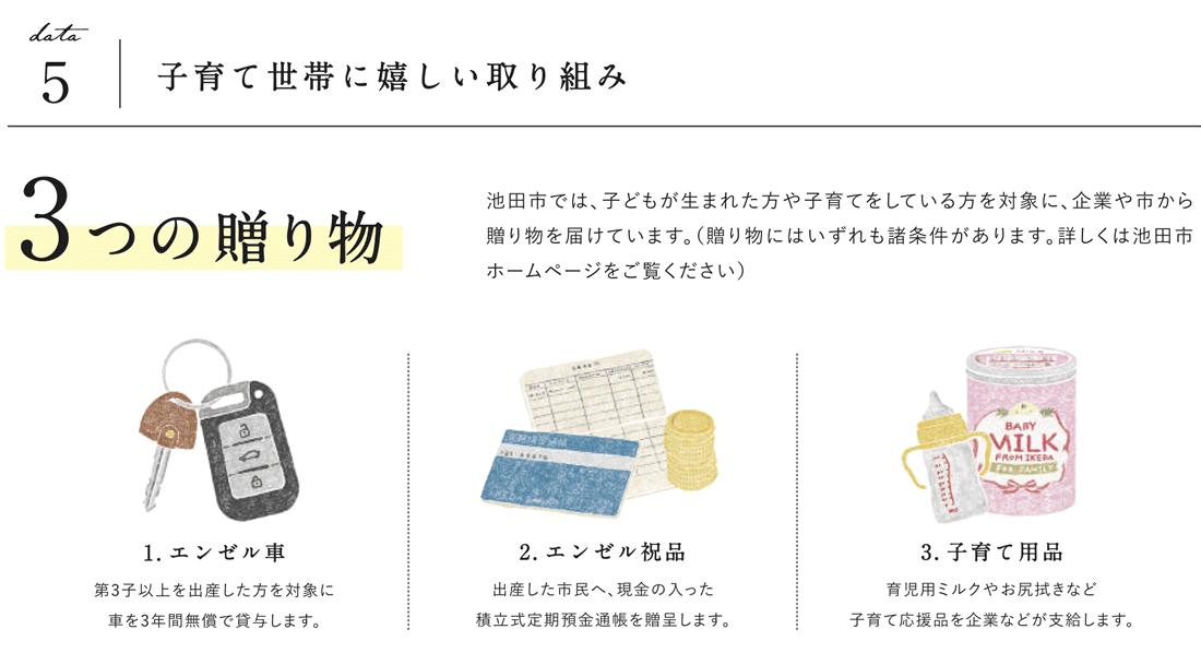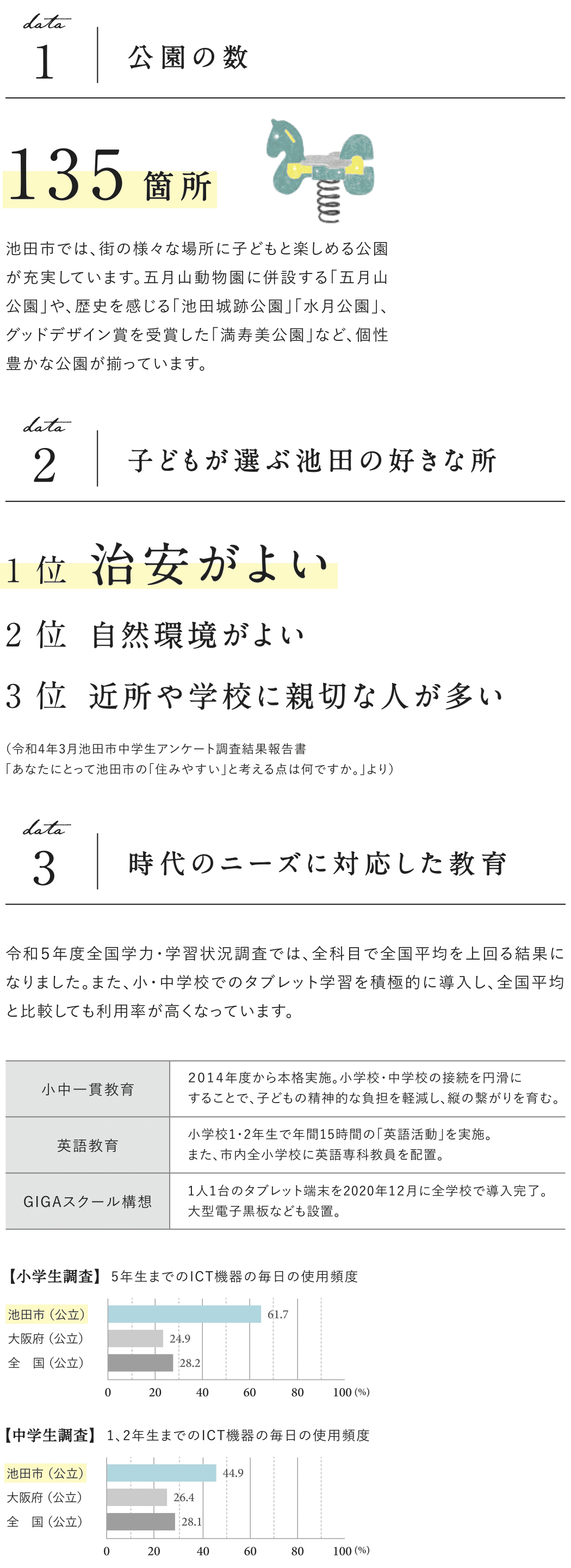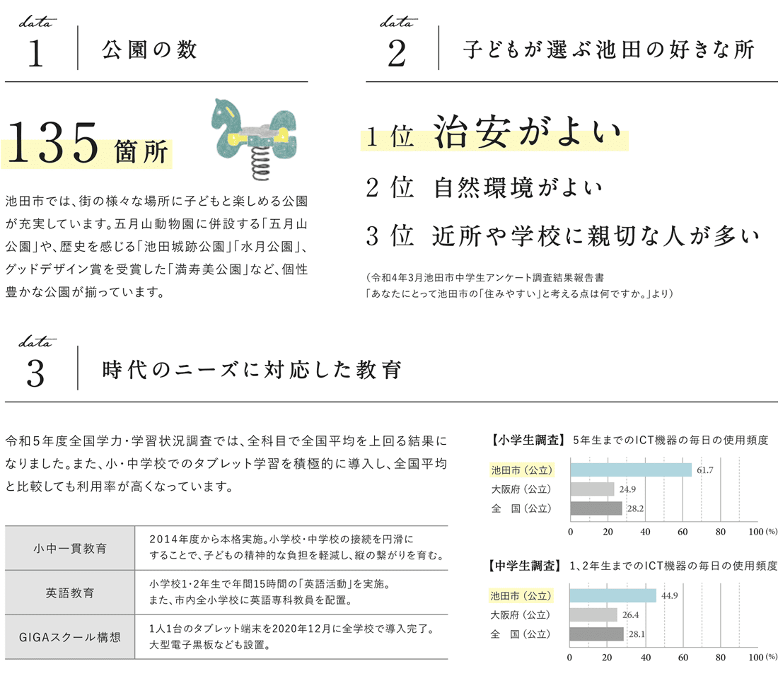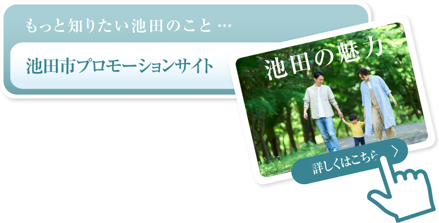 小中一貫教育の推進、 子どもと楽しめる公園もそろう、自然豊かな住環境。 住む方々が気軽に参加できる豊富なイベントや 子育て世代に嬉しい取り組みの実施など ご家族が楽しく安心して暮らせる「池田」です。