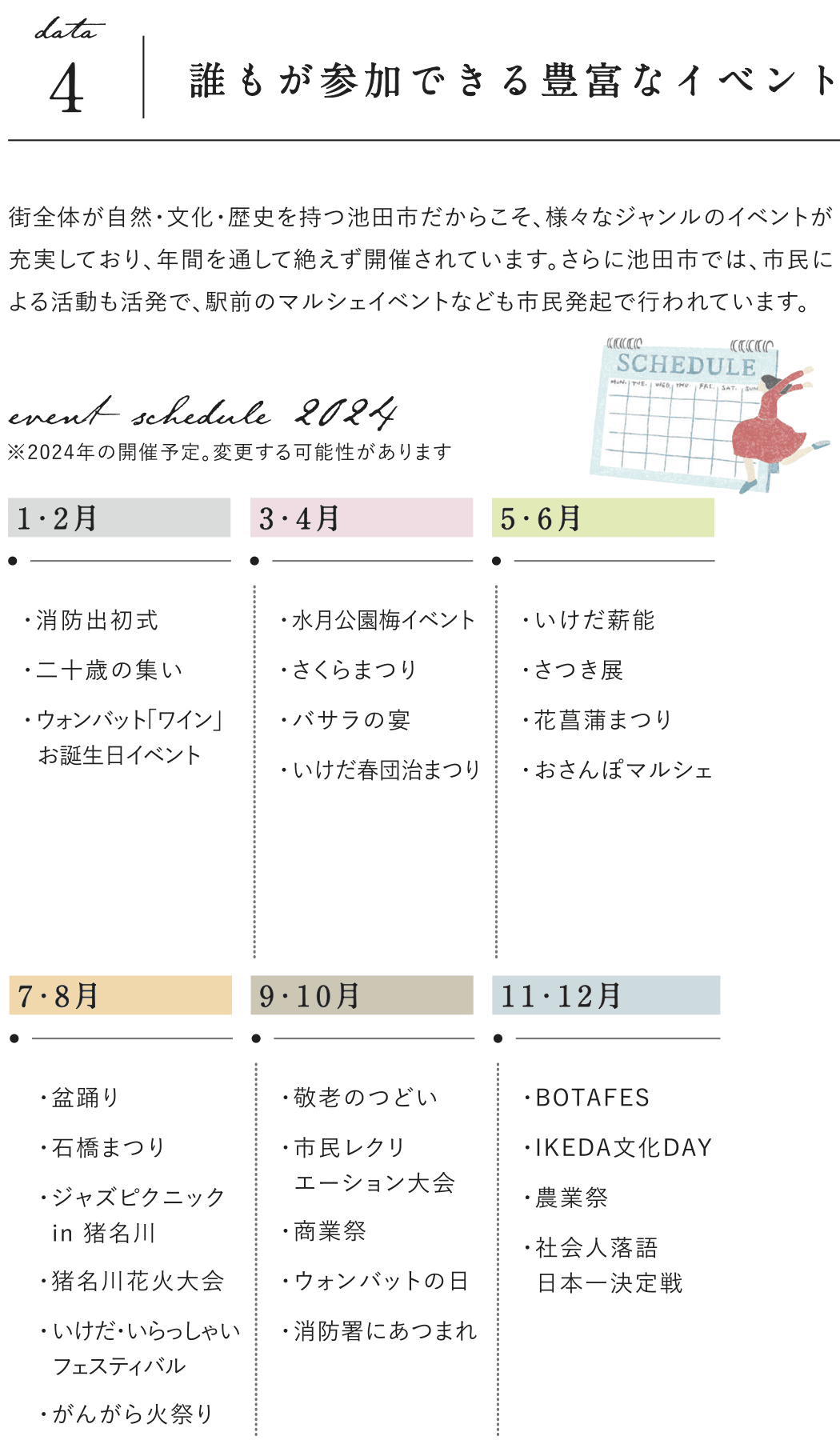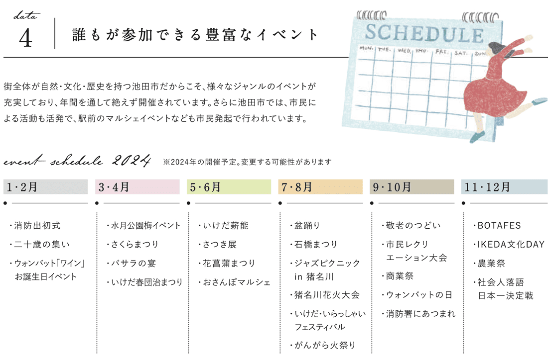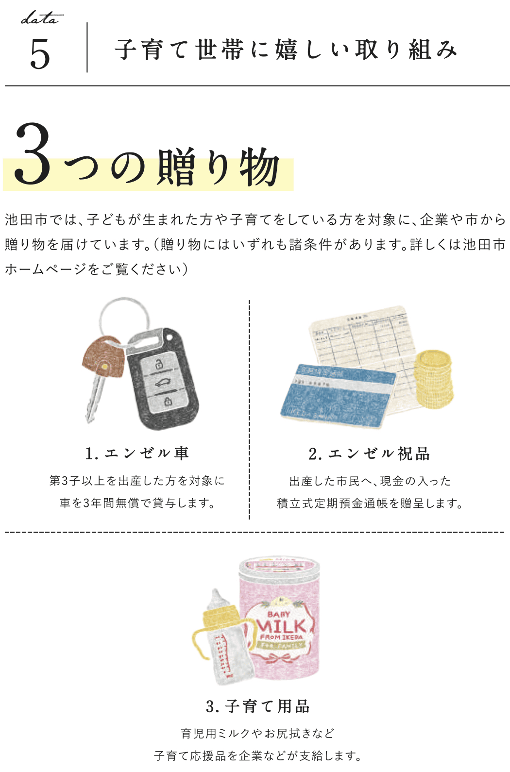 小中一貫教育の推進、 子どもと楽しめる公園もそろう、自然豊かな住環境。 住む方々が気軽に参加できる豊富なイベントや 子育て世代に嬉しい取り組みの実施など ご家族が楽しく安心して暮らせる「池田」です。