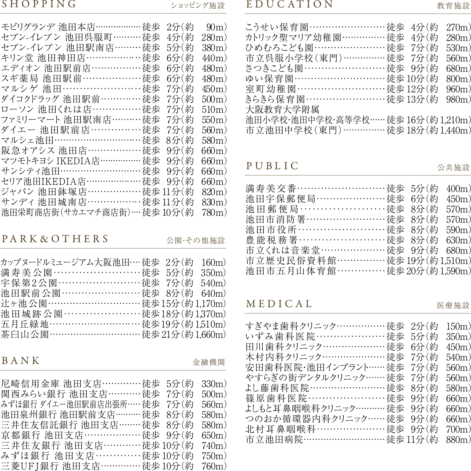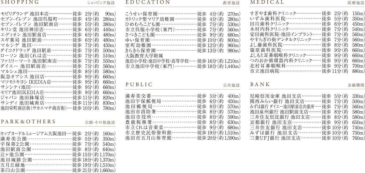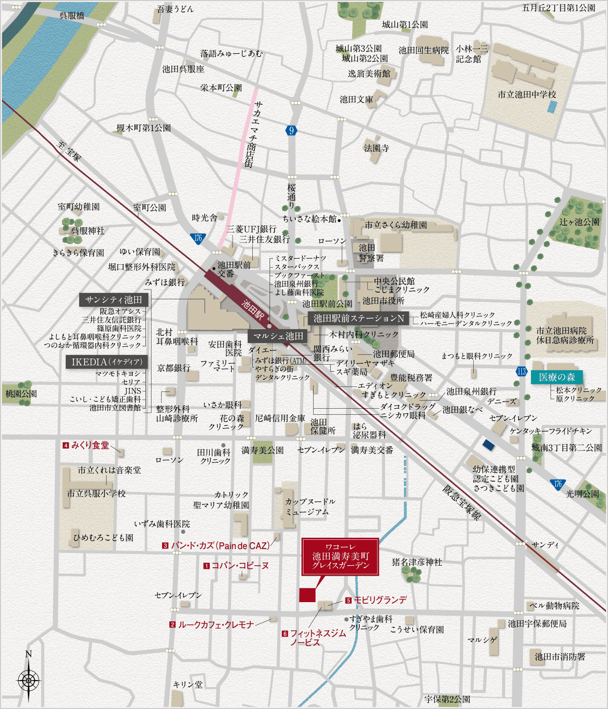 開校から約83年の「市立呉服小学校」、約75年の「市立池田中学校」という歴史ある両校が本物件の通学指定校。池田市の施策によりお互いの連携を深め、学びの機会を充実させる小中一貫教育に取り組んでいます。また周辺には多くの保育園・幼稚園や高等学校も揃っており、身近な自然と触れ合える公園やスポットも点在するなど豊かな子育て環境が魅力です。