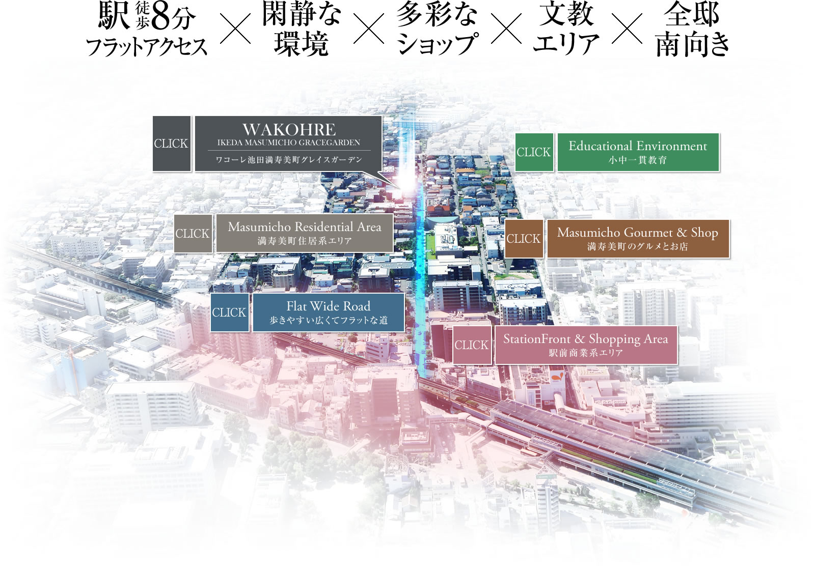 美しく潤う満寿美町にふさわしく日々のライフシーンも、もっと豊かに。ご家族やご夫婦の記念日などを祝ったり、またお一人の時間を満喫したり。上質な住宅地として成熟を重ねた満寿美町界隈にはライフシーンに合わせたカフェやベーカリー、レストランなどが点在しています。