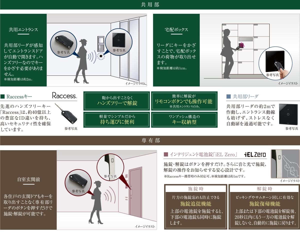 各邸の玄関ドアもキーを携帯したままリーダのボタンを押すだけ。高いセキュリティ性と快適性を両立した先進システムです。
