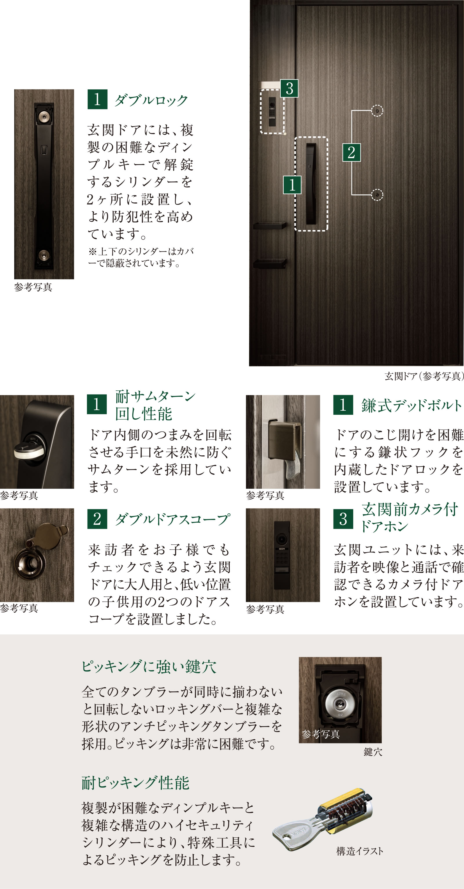 ピッキングやサムターン回しなど、さまざまな不正解錠を防ぐセキュリティ機能を玄関ドアに設けました。