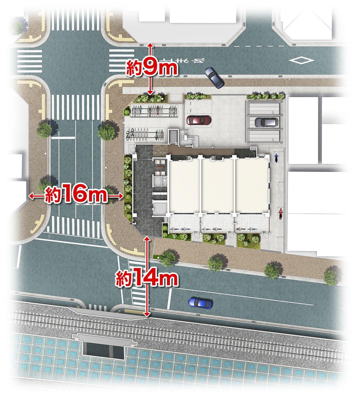 駅近でありながら周囲としっかり距離を確保した開放的な3方角地に誕生します。駅から続く整備された歩道や街路樹の潤いなどを、快適な歩き心地の家路です。