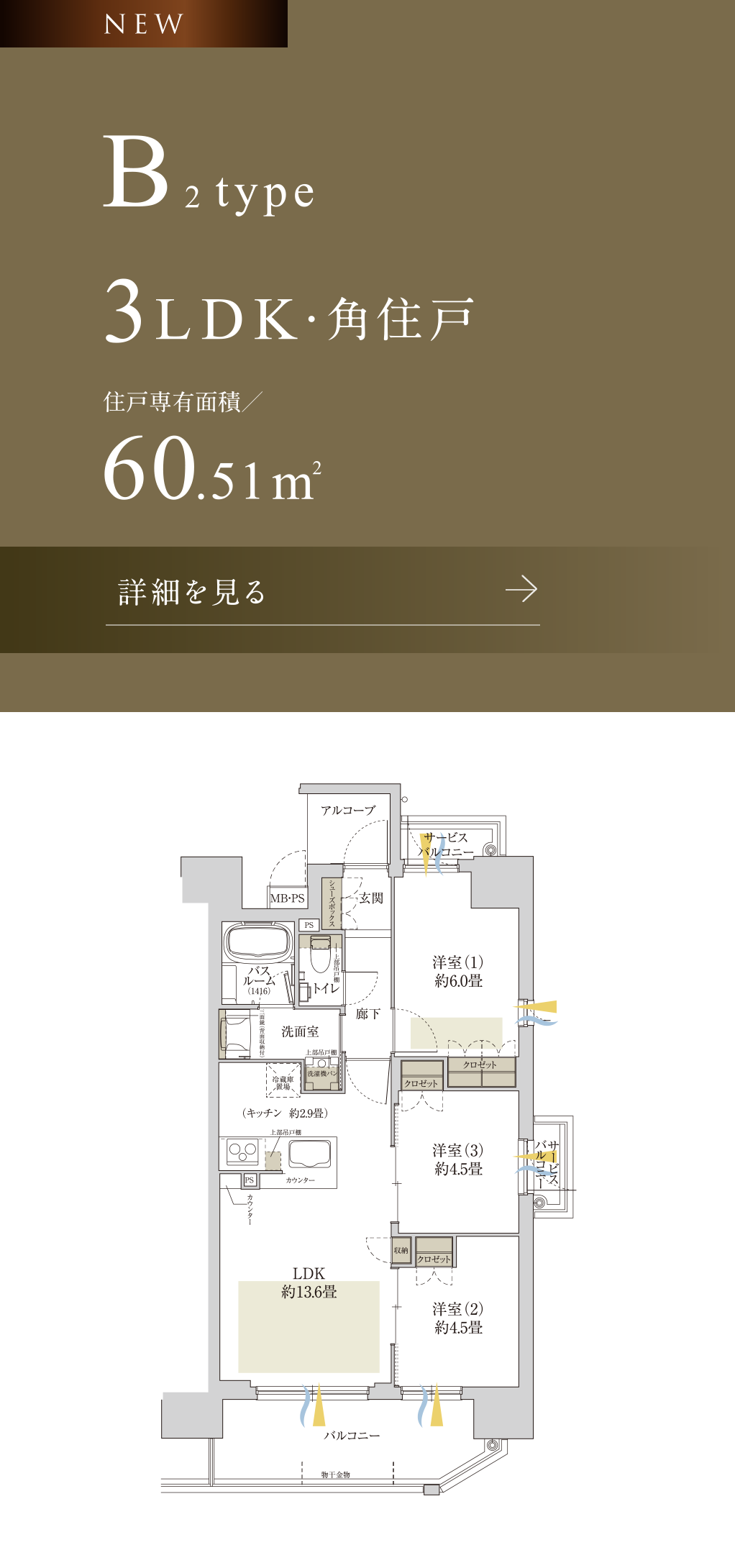 プライバシー性が高く全邸角部屋なので、光と風を室内に取り込むプランニングです。
