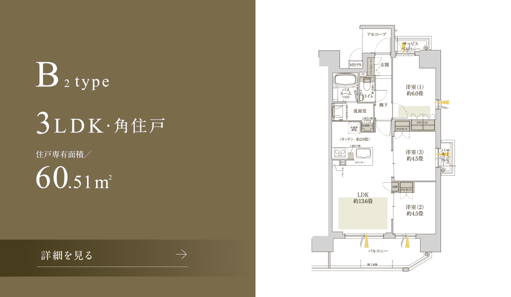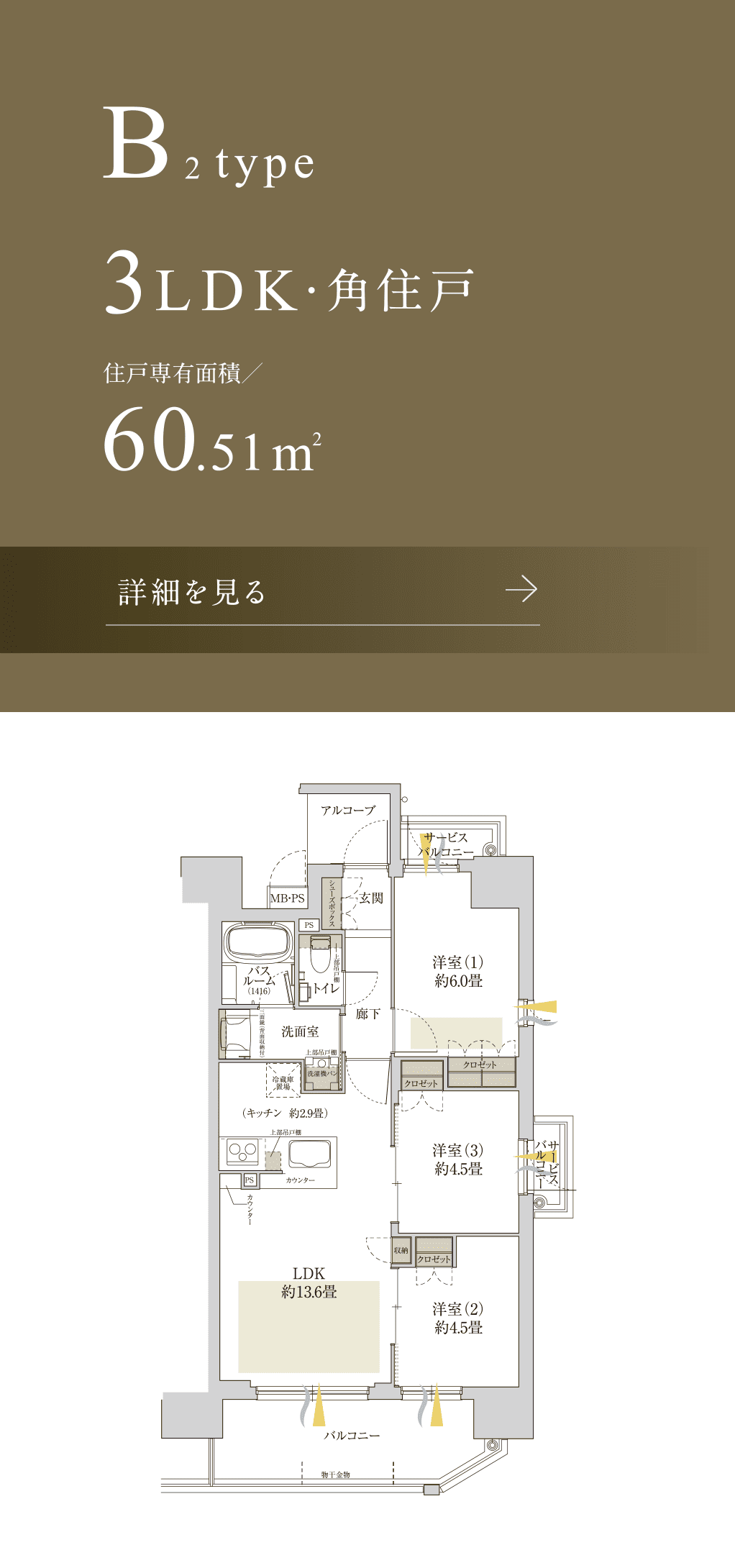 全邸角住戸、高い機能性の3LDKプラン。