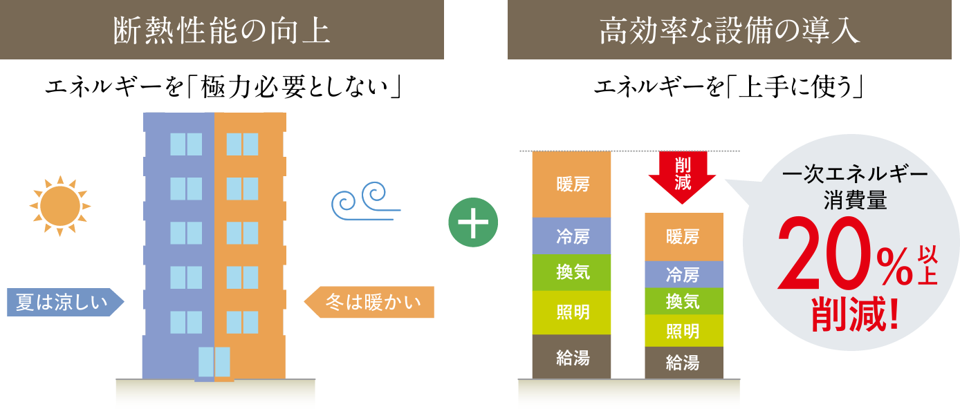 建物の外皮断熱性能の向上と高効率の省エネ設備等の導入により、