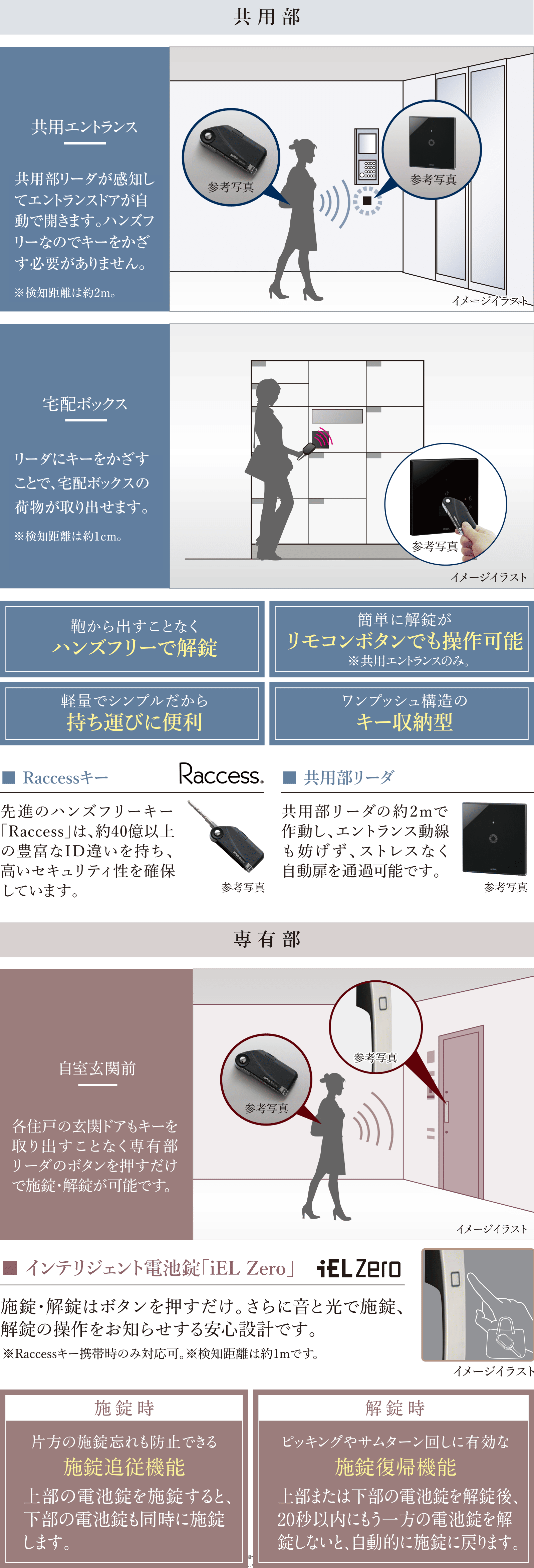 各邸の玄関ドアもキーを携帯したままリーダのボタンを押すだけで施錠・解錠。高いセキュリティ性と快適性を両立した先進システムです。