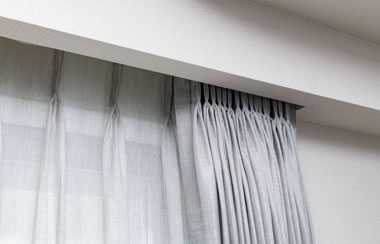 カーテンレールをさりげなく隠し、窓辺を美しく演出するカーテンボックスをリビング・ダイニングに設けました。