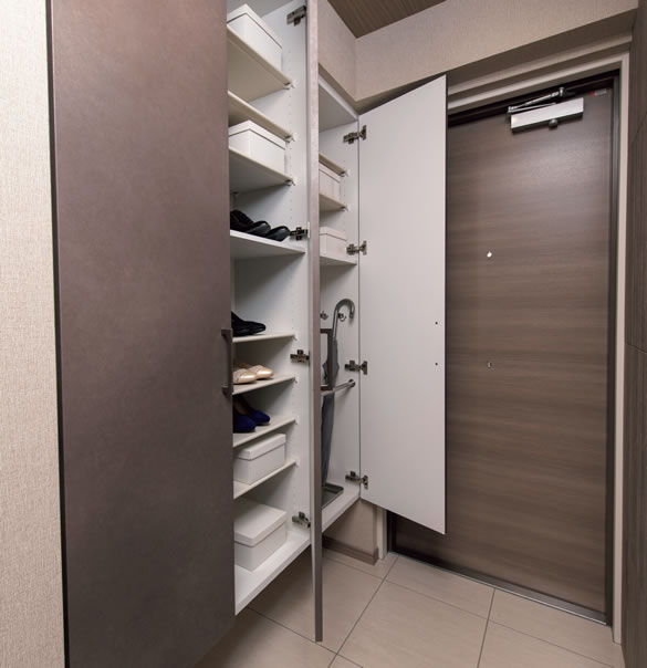 可動棚によりブーツなどもすっきり収納できる機能的なトールタイプのシューズボックスを採用しています。※タイプにより仕様が異なります。