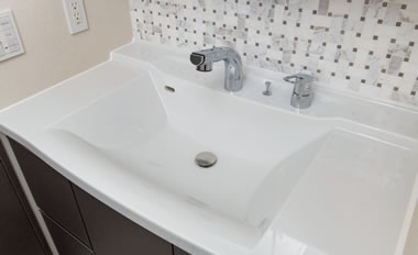 汚れにくくキズつきにくい人造大理石一体型カウンターを採用しました。上質な素材感で、お手入れも簡単です。